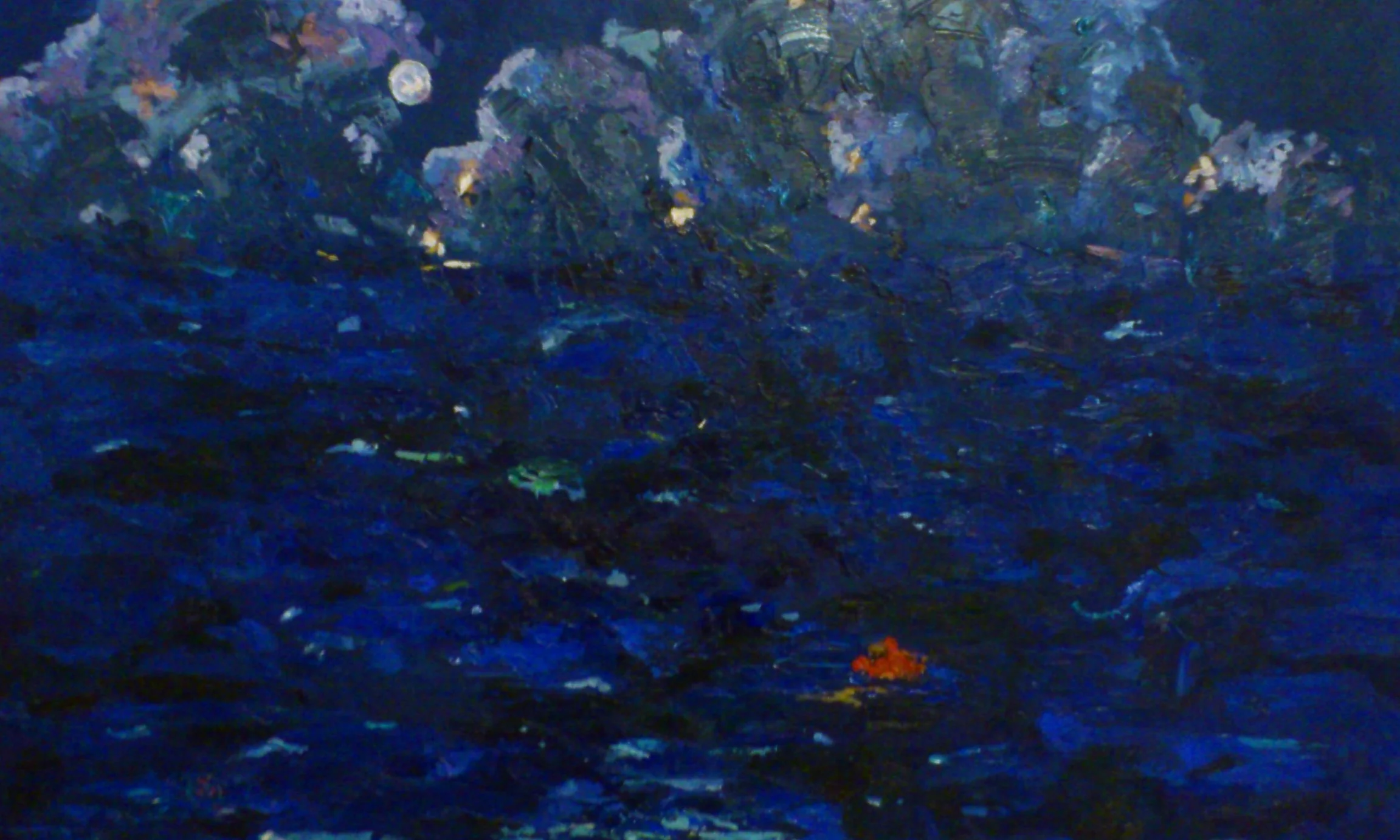 This is another painting by the same artist, depicting a now very familiar theme of crossing the sea in search of a better life, with the moon symbolising both threat and hope.